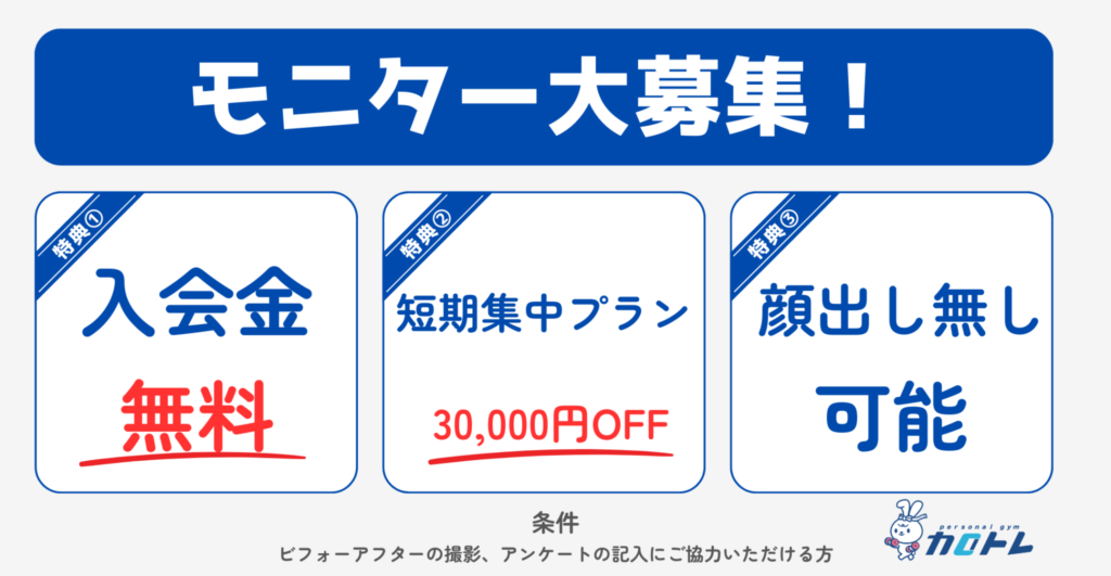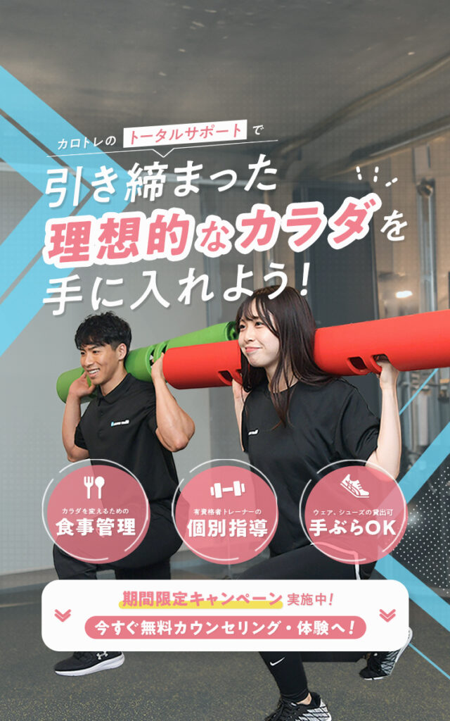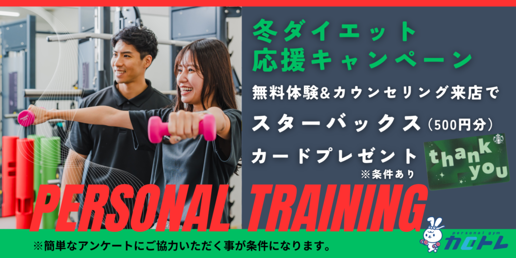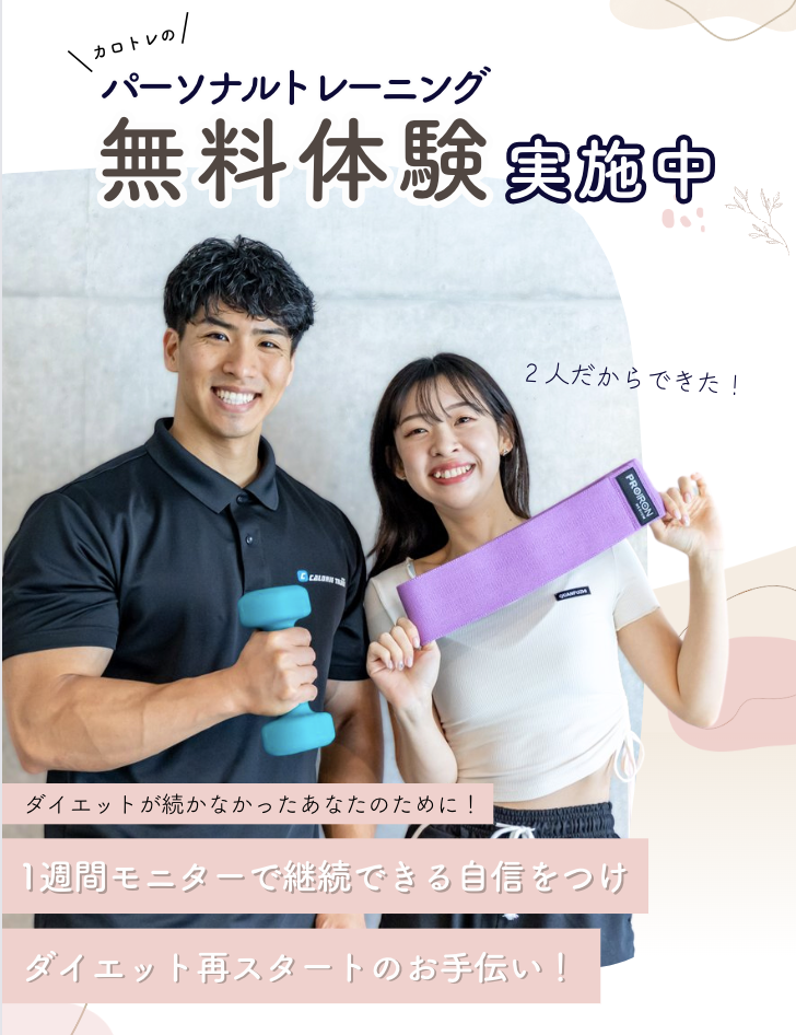 今だけ限定で、パーソナルトレーニングの体験が「 通常¥ 5,000のところ¥ 0 」自己流ダイエットで何度も失敗、リバウンドしてしまった方、ジムに通ってるけどなかなか効果がでない方、プロのパーソナルトレーナーの指導を是非ご体験ください。